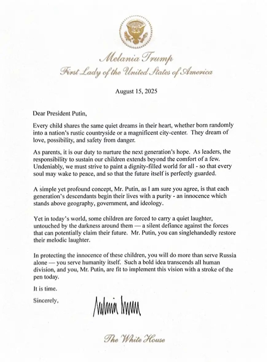 وفي نص الرسالة، قالت ميلانيا: "من خلال حماية براءة هؤلاء الأطفال، فإنك ستفعل أكثر من مجرد خدمة روسيا وحدها - أنت تخدم الإنسانية نفسها..، السيد بوتين، مؤهل لتنفيذ هذه الرؤية بجرّة قلم اليوم".