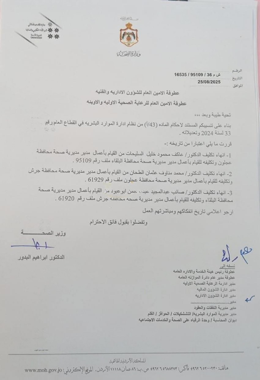 بالأسماء .. وزير الصحة يجري تنقلات بين مدراء صحة البلقاء وعجلون وجرش