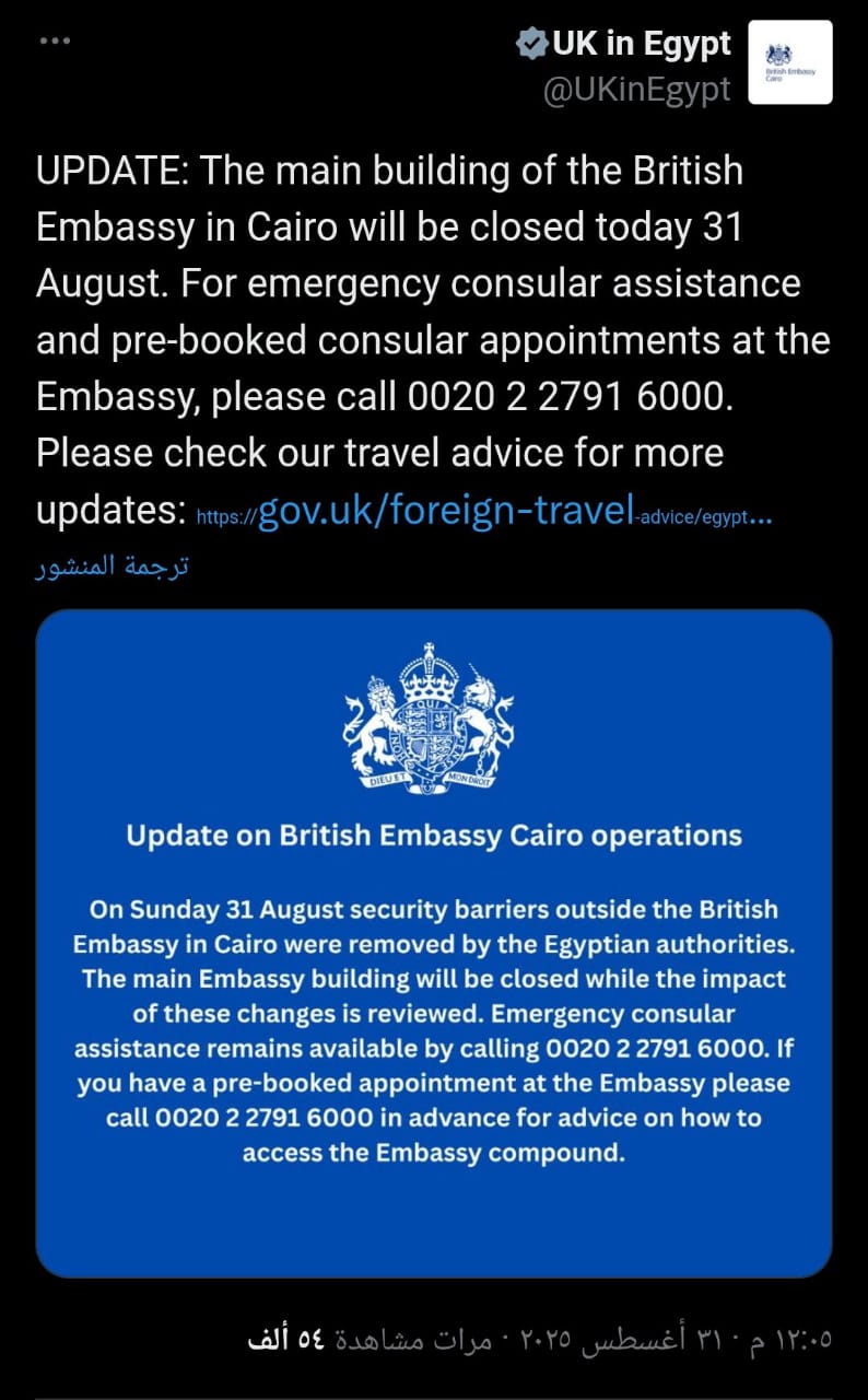 وقالت السفارة البريطانية في تدوينة عبر حسابها الرسمي على منصة "إكس: "أزالت السلطات المصرية، الأحد 31 أغسطس، الحواجز الأمنية خارج السفارة البريطانية في القاهرة، سيغلق المبنى الرئيسي للسفارة حتى تتم مراجعة تأثير هذه التغييرات".
