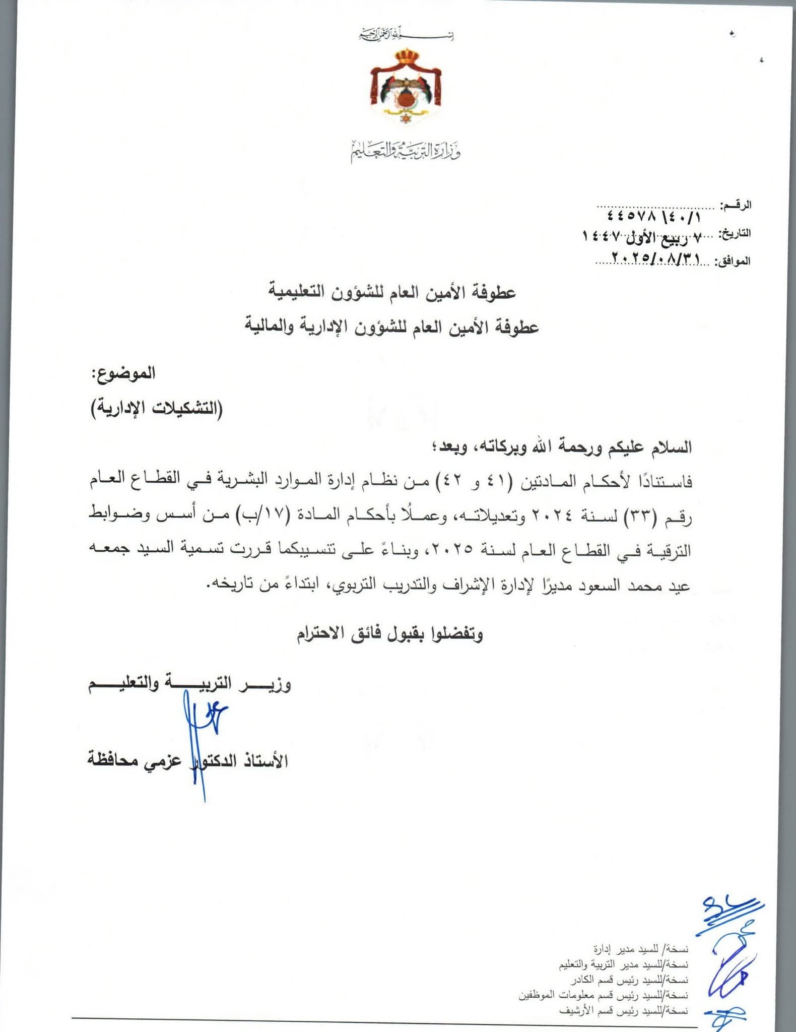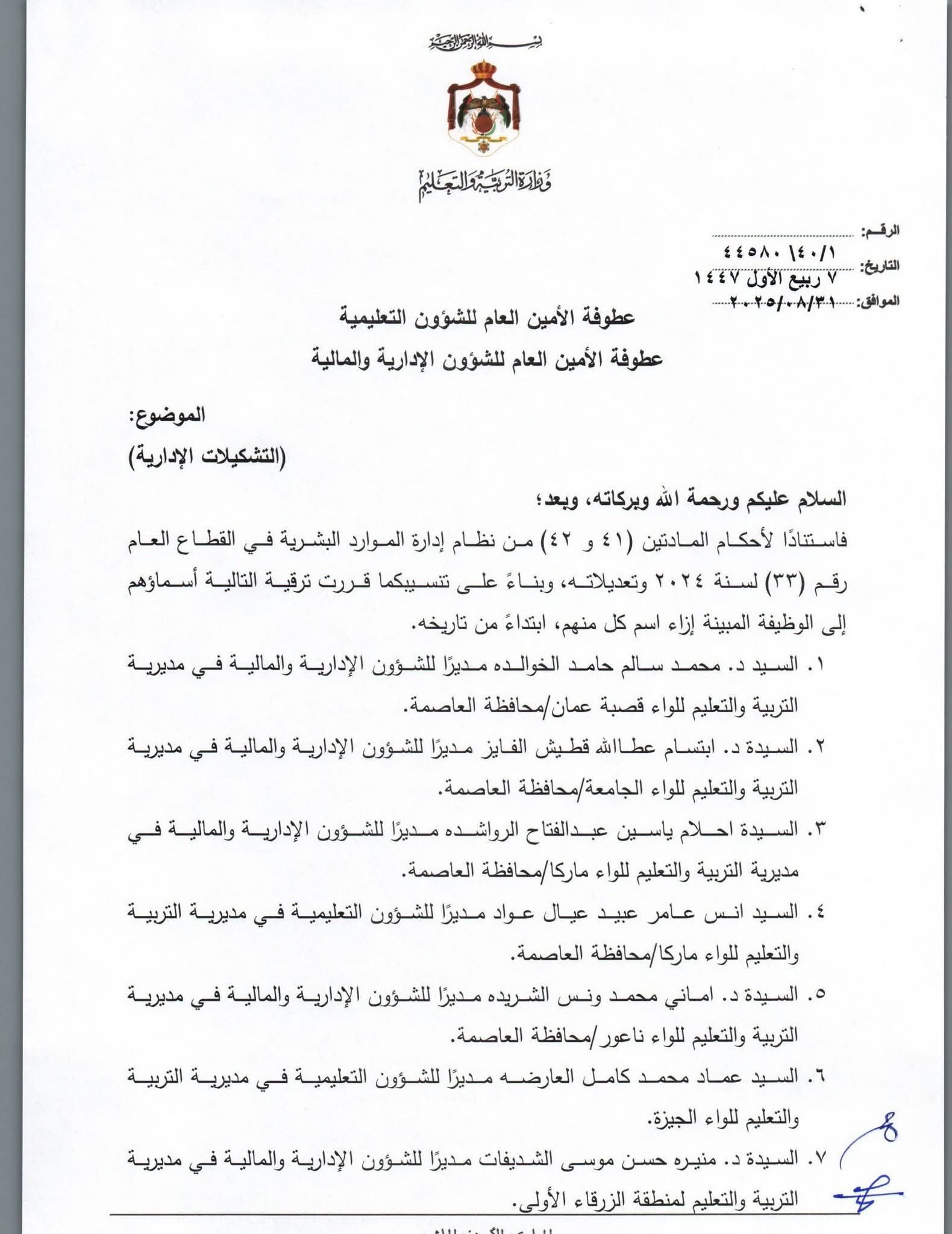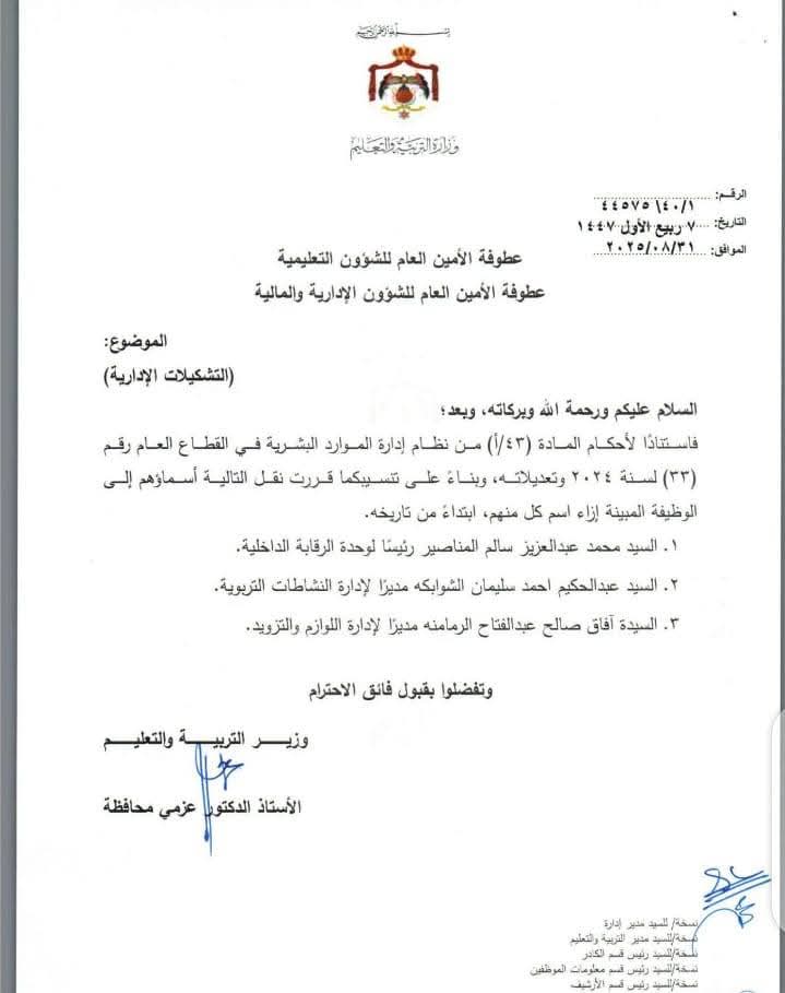 أصدرت وزارة التربية والتعليم الأردنية مجموعة من التشكيلات الإدارية الجديدة، وشملت التعديلات ترقية ونقل عدد من مديري الشؤون الإدارية والمالية. صدرت القرارات بالاستناد إلى نظام إدارة الموارد البشرية في القطاع العام، وتأتي في إطار حرص الوزارة على تعزيز الكفاءة الإدارية.