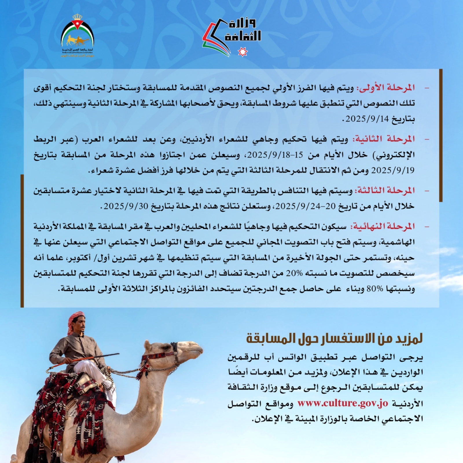 لمزيد من الاستفسار حول المسابقة يرجى التواصل عبر تطبيق الواتس أب للرقمين الواردين في هذا الإعلان، ولمزيد من المعلومات أيضا يمكن للمتسابقين الرجوع إلى موقع وزارة الثقافة الأردنية www.culture.gov.jo: ومواقع التواصل الاجتماعي الخاصة بالوزارة المبينة في الإعلان.
