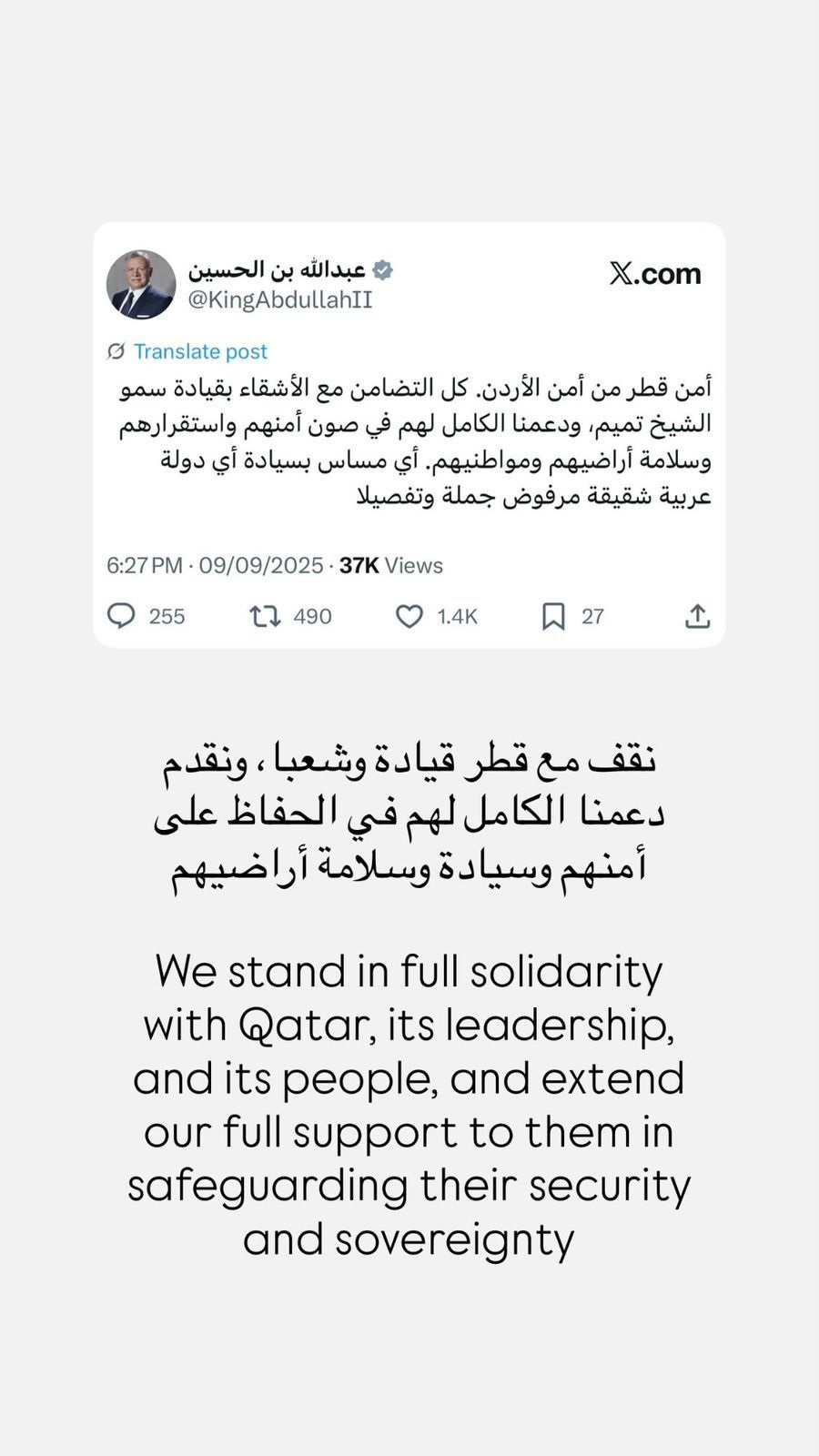 وقال ولي العهد عبر حسابه على "انستغرام"، " نقف مع قطر قيادة وشعبا، ونقدم دعمنا الكامل لهم في الحفاظ على أمنهم وسيادة وسلامة أراضيهم".