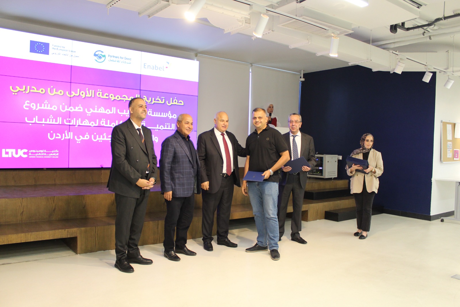 رعى وزير العمل الدكتور خالد البكار اليوم الخميس حفل تخريج المجموعة الأولى من تدريب 21 مدربا من مدربي مؤسسة التدريب المهني ضمن أنشطة مشروع التنمية المتكاملة لمهارات الشباب والنساء واللاجئين السوريين في الأردن والممول من الإتحاد الأوروبي المنفذ من قبل شركاء للأفضل بالشراكة مع LTUC ومؤسسة الملك حسين.