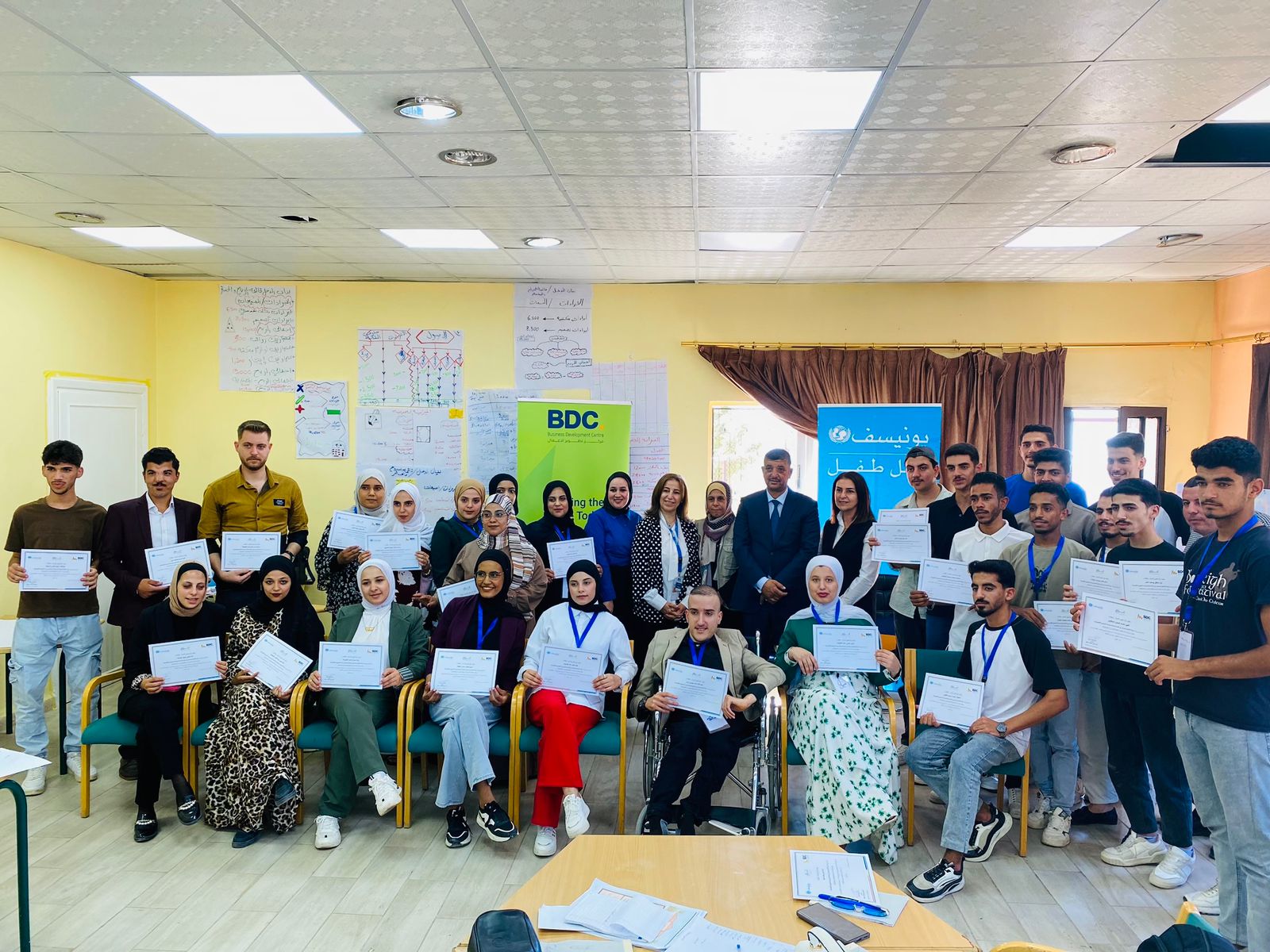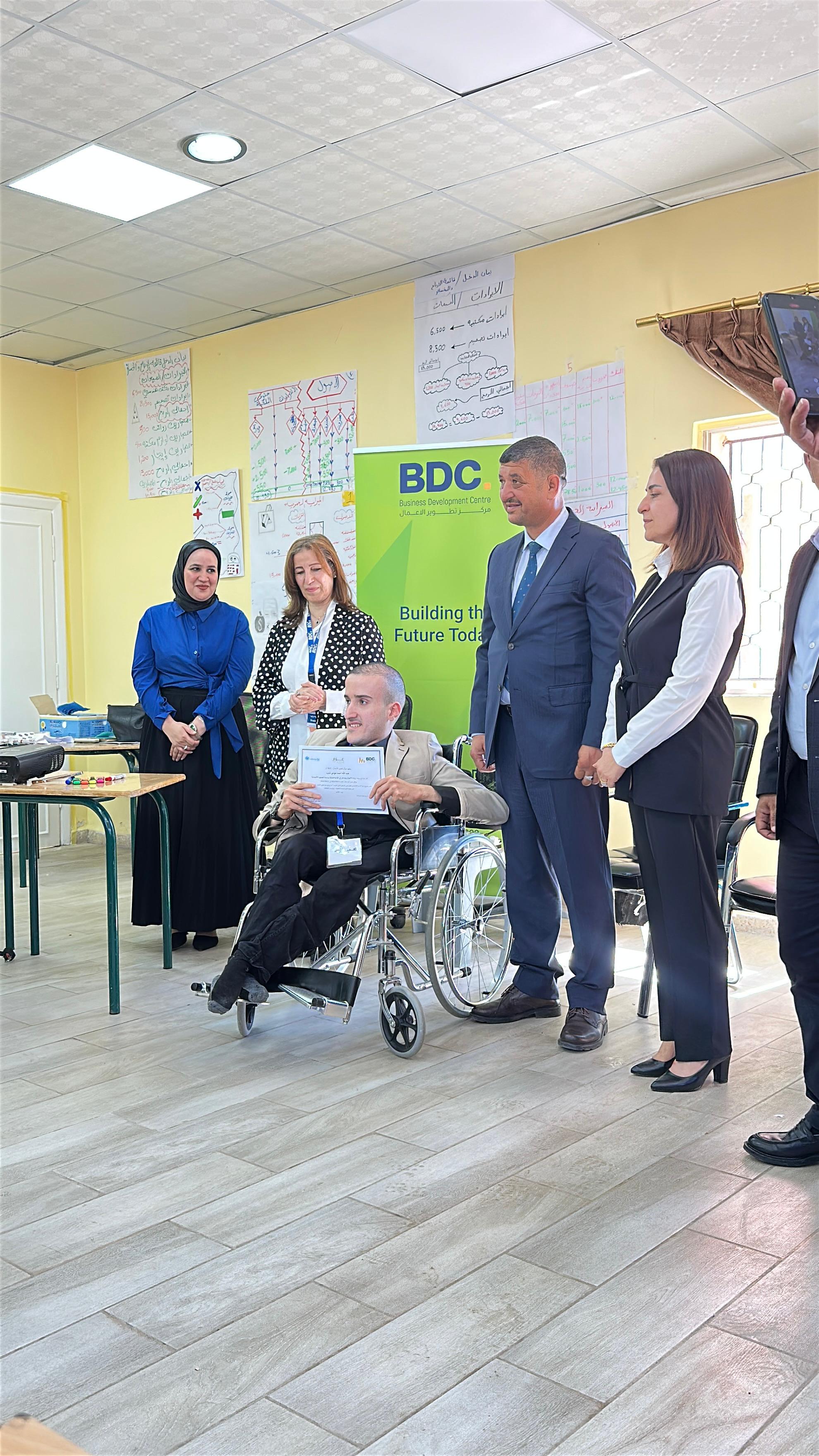 إربد – اختتم مركز تطوير الأعمال (BDC)، وبحضور متصرف لواء بني كنانة السيد خلدون ارتيمه، ورئيس لجنة بلدية خالد بن الوليد المهندسة راوية غرايبة، تدريب "ريادة الأعمال والتمكين الاقتصادي" الذي استهدف شباب وشابات اللواء من أصحاب الأفكار والمشاريع الريادية، وذلك ضمن أنشطة مشروع "التمكين الاقتصادي لخلق فرص التشغيل الذاتي"، أحد برامج المركز والمدعوم من منظمة الأمم المتحدة للطفولة (اليونيسف).