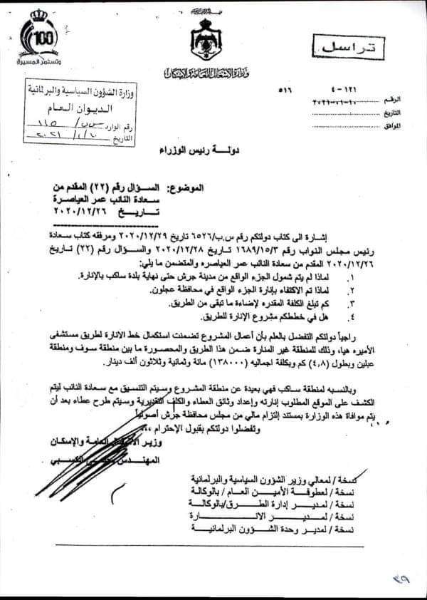 ولفت إلى أنه سيقوم بالتنسيق مع النائب العياصرة للكشف على الجزء المطلوب انارته في منطقة ساكب البعيدة عن موقع المشروع، وانارته واعداد وثائق العطاء والكلف التقديرية له وسيتم طرح عطاء بعد أن يتم موافاة الوزارة بمستند التزام مالي من مجلس محافظة جرش أصولياً.