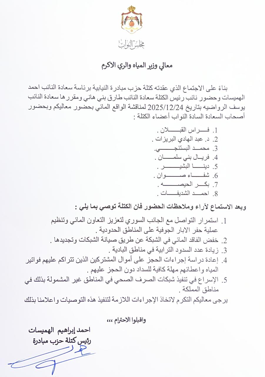 وأكد الهميسات أهمية العمل على تخفيض الفاقد المائي باعتباره أحد أبرز التحديات التي تواجه قطاع المياه وتنعكس مباشرة على الواقع المعيشي للمواطنين، مشيرًا إلى أن الكتلة معنية بمتابعة القضايا الخدمية التي تهم المواطنين في مختلف المحافظات.