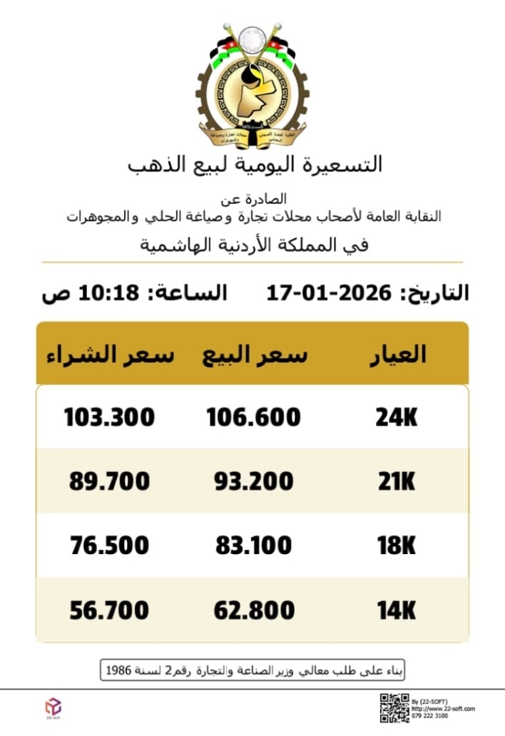 وبحسب التسعيرة الصباحية، بلغ سعر الغرام الواحد من الذهب عيارات 24 و18 و14 لغايات البيع من محالّ الصاغة 106.60 و83.10 و 93.20 دينار على الترتيب.
