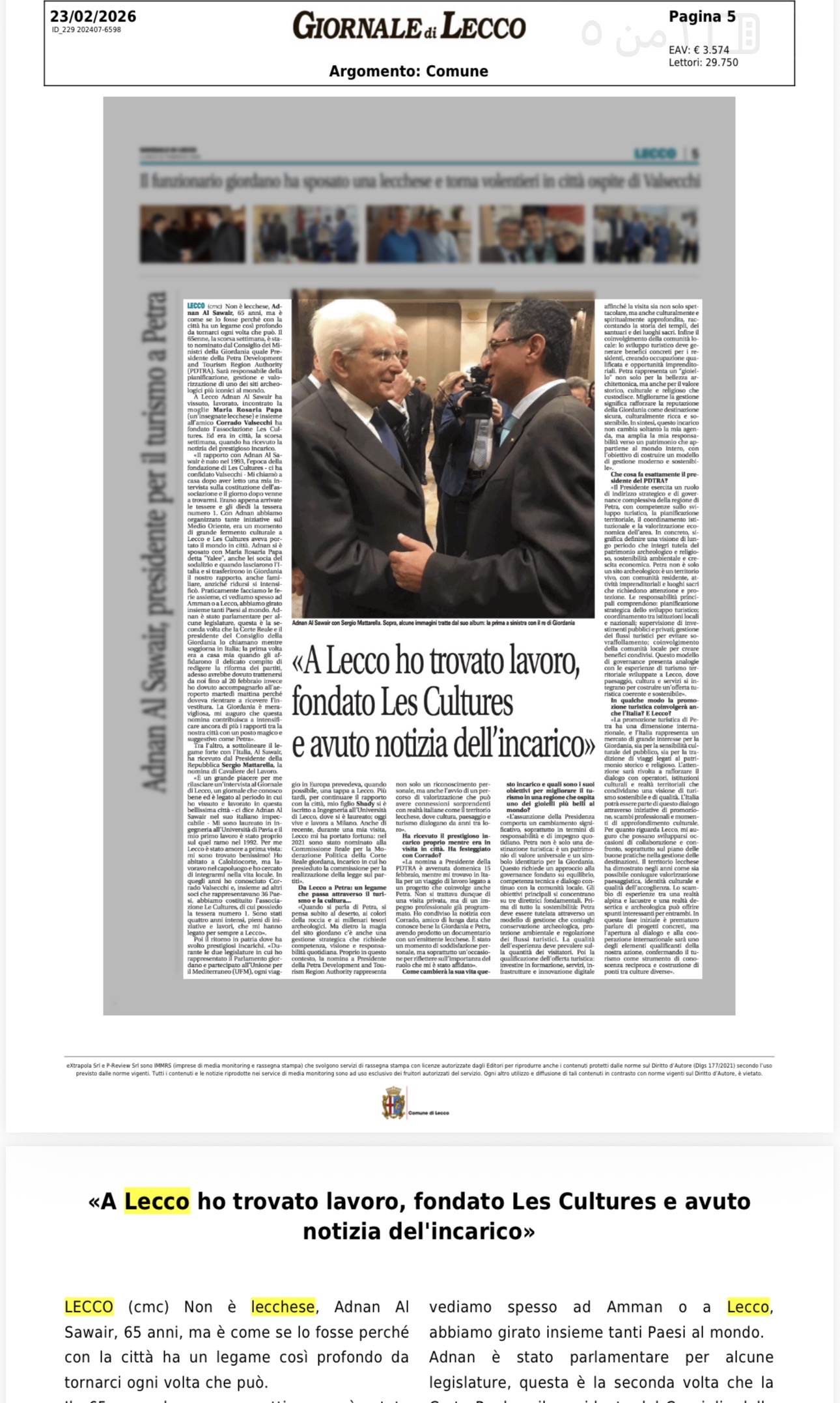 ويعكس نشر التقرير في صحيفة Giornale di Lecco البعد الدولي لتعيينه، ويؤكد عمق الروابط الإنسانية والثقافية التي تجمع بين البترا ومدينة ليكو الإيطالية.