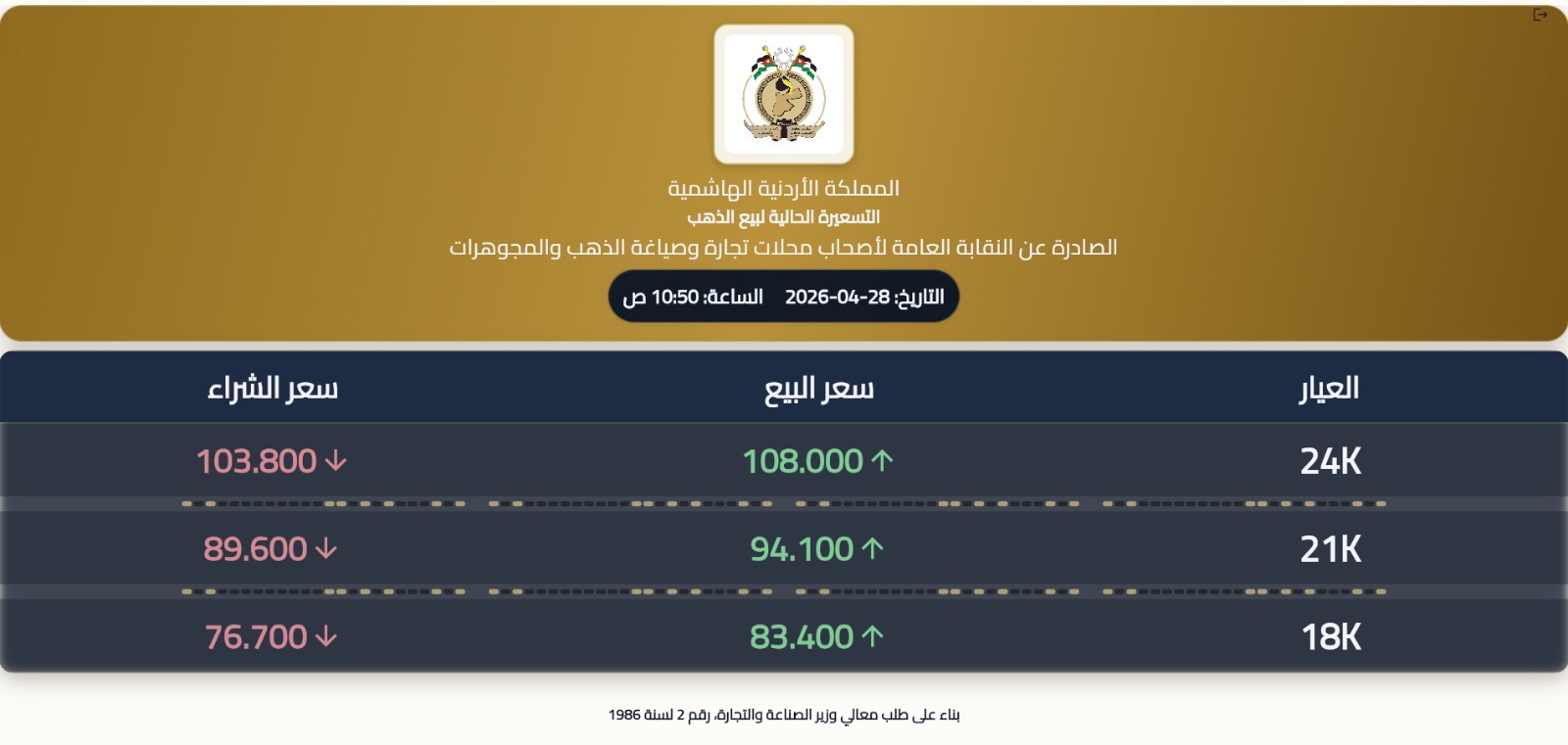 وبحسب التسعيرة، بلغ سعر بيع غرام الذهب من عيار 21 نحو 94.100 دينار، فيما بلغ سعر الشراء 89.600 دينار .