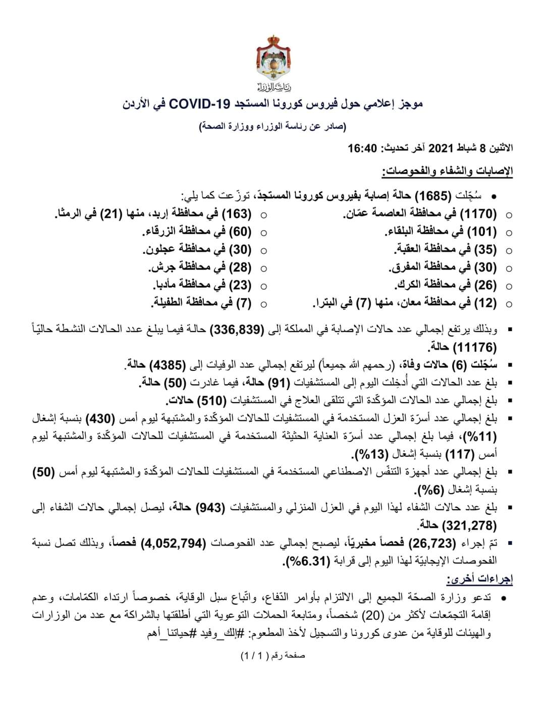 (1170) في محافظة العاصمة عمّان.(163) في محافظة إربد، منها (21) في الرمثا.(101) في محافظة البلقاء.(60) في محافظة الزرقاء.(35) في محافظة العقبة.(30) في محافظة المفرق.(30) في محافظة عجلون.(28) في محافظة جرش.(26) في محافظة الكرك.(23) في محافظة مأدبا.(12) في محافظة معان، منها (7) في البترا.(7) في محافظة الطفيلة.وبذلك يرتفع إجمالي عدد حالات الإصابة في المملكة إلى (336,839) حالة فيما يبلغ عدد الحالات النشطة حاليّاً (11176) حالة.سُجّلت (6) حالات وفاة، (رحمهم الله جميعاً) ليرتفع إجمالي عدد الوفيات إلى (4385) حالة.بلغ عدد الحالات التي أُدخِلت اليوم إلى المستشفيات (91) حالة، فيما غادرت (50) حالة.بلغ إجمالي عدد الحالات المؤكّدة التي تتلقى العلاج في المستشفيات (510) حالات.بلغ إجمالي عدد أسرّة العزل المستخدمة في المستشفيات للحالات المؤكّدة والمشتبهة ليوم أمس (430) بنسبة إشغال (11%)، فيما بلغ إجمالي عدد أسرّة العناية الحثيثة المستخدمة في المستشفيات للحالات المؤكّدة والمشتبهة ليوم أمس (117) بنسبة إشغال (13%).بلغ إجمالي عدد أجهزة التنفّس الاصطناعي المستخدمة في المستشفيات للحالات المؤكّدة والمشتبهة ليوم أمس (50) بنسبة إشغال (6%).بلغ عدد حالات الشفاء لهذا اليوم في العزل المنزلي والمستشفيات (943) حالة، ليصل إجمالي حالات الشفاء إلى (321,278) حالة.تمّ إجراء (26,723) فحصاً مخبريّاً، ليصبح إجمالي عدد الفحوصات (4,052,794) فحصاً، وبذلك تصل نسبة الفحوصات الإيجابيّة لهذا اليوم إلى قرابة (6.31%).