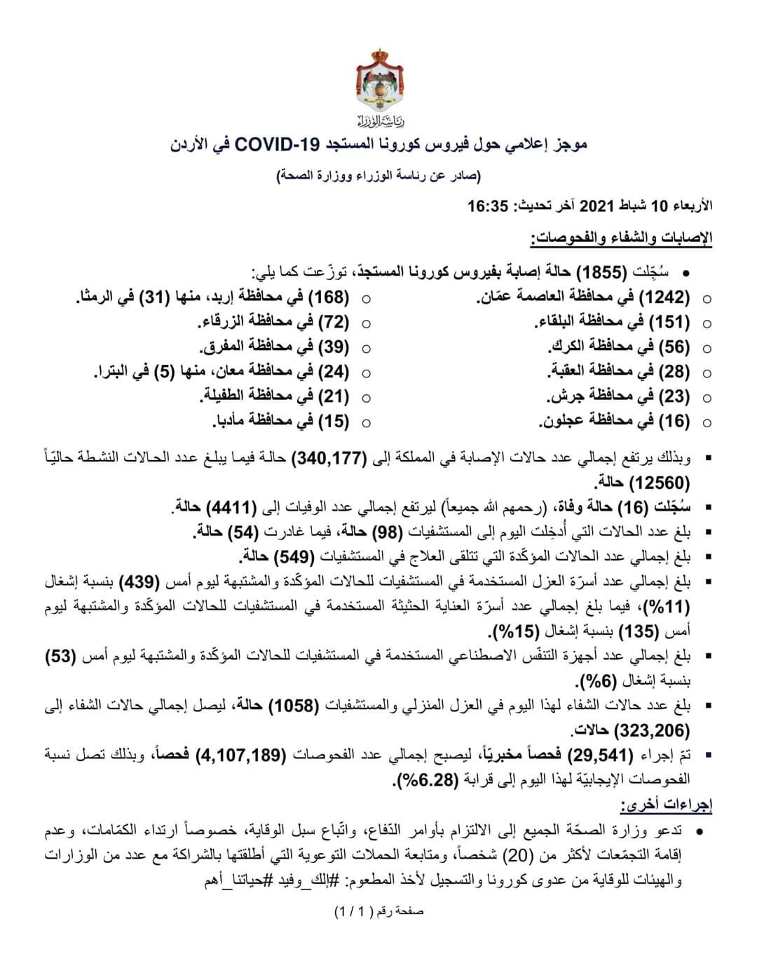 (1242) في محافظة العاصمة عمّان.(168) في محافظة إربد، منها (31) في الرمثا.(151) في محافظة البلقاء.(72) في محافظة الزرقاء.(56) في محافظة الكرك.(39) في محافظة المفرق.(28) في محافظة العقبة.(24) في محافظة معان، منها (5) في البترا.(23) في محافظة جرش.(21) في محافظة الطفيلة.(16) في محافظة عجلون. (15) في محافظة مأدبا.وبذلك يرتفع إجمالي عدد حالات الإصابة في المملكة إلى (340,177) حالة فيما يبلغ عدد الحالات النشطة حاليّاً (12560) حالة.سُجّلت (16) حالة وفاة، (رحمهم الله جميعاً) ليرتفع إجمالي عدد الوفيات إلى (4411) حالة.بلغ عدد الحالات التي أُدخِلت اليوم إلى المستشفيات (98) حالة، فيما غادرت (54) حالة.بلغ إجمالي عدد الحالات المؤكّدة التي تتلقى العلاج في المستشفيات (549) حالة.بلغ إجمالي عدد أسرّة العزل المستخدمة في المستشفيات للحالات المؤكّدة والمشتبهة ليوم أمس (439) بنسبة إشغال (11%)، فيما بلغ إجمالي عدد أسرّة العناية الحثيثة المستخدمة في المستشفيات للحالات المؤكّدة والمشتبهة ليوم أمس (135) بنسبة إشغال (15%).بلغ إجمالي عدد أجهزة التنفّس الاصطناعي المستخدمة في المستشفيات للحالات المؤكّدة والمشتبهة ليوم أمس (53) بنسبة إشغال (6%).بلغ عدد حالات الشفاء لهذا اليوم في العزل المنزلي والمستشفيات (1058) حالة، ليصل إجمالي حالات الشفاء إلى (323,206) حالات.تمّ إجراء (29,541) فحصاً مخبريّاً، ليصبح إجمالي عدد الفحوصات (4,107,189) فحصاً، وبذلك تصل نسبة الفحوصات الإيجابيّة لهذا اليوم إلى قرابة (6.28%).