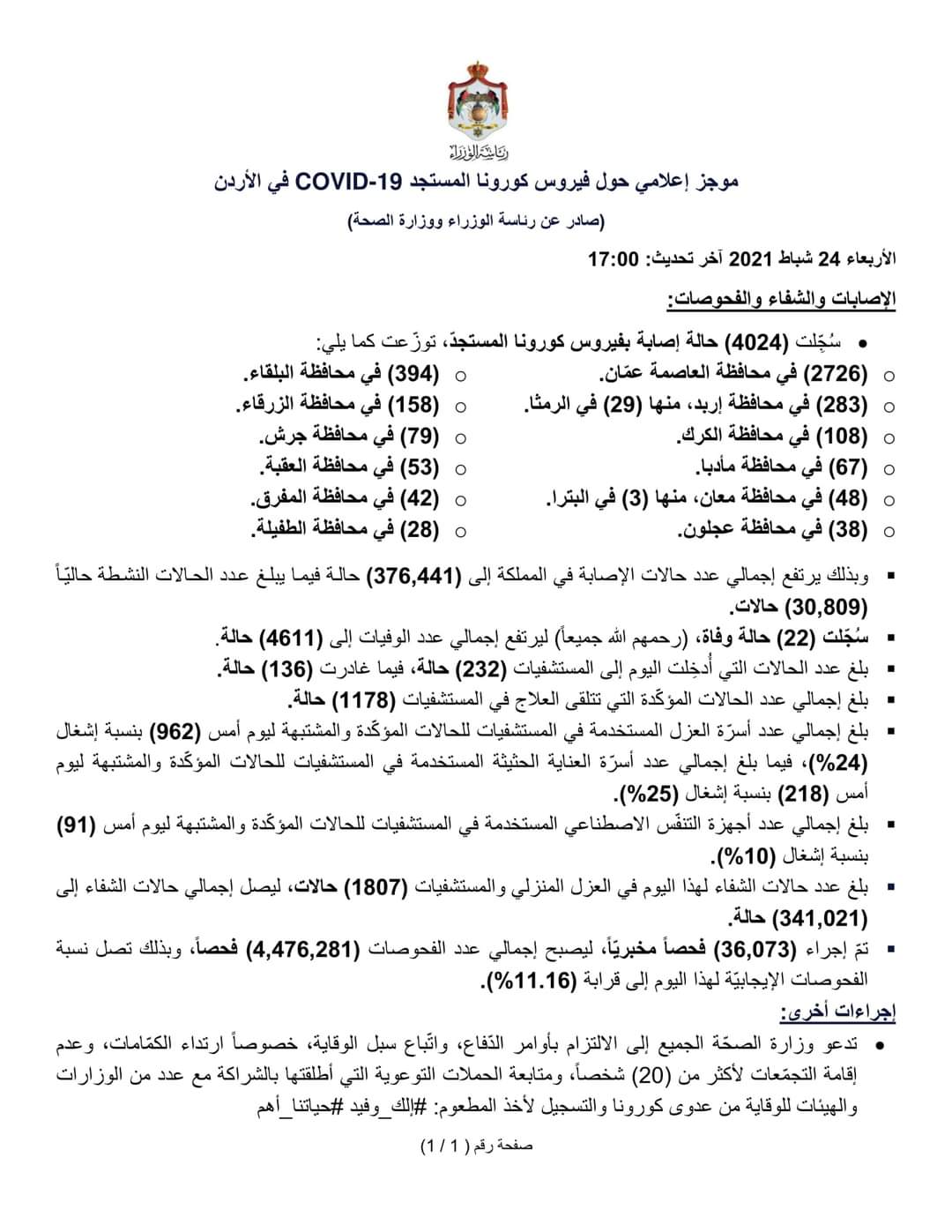 (2726) في محافظة العاصمة عمّان.(394) في محافظة البلقاء.(283) في محافظة إربد، منها (29) في الرمثا.(158) في محافظة الزرقاء.(108) في محافظة الكرك.(79) في محافظة جرش.(67) في محافظة مأدبا.(53) في محافظة العقبة.(48) في محافظة معان، منها (3) في البترا.(42) في محافظة المفرق.(38) في محافظة عجلون.(28) في محافظة الطفيلة.وبذلك يرتفع إجمالي عدد حالات الإصابة في المملكة إلى (376,441) حالة فيما يبلغ عدد الحالات النشطة حاليّاً (30,809) حالات.سُجّلت (22) حالة وفاة، (رحمهم الله جميعاً) ليرتفع إجمالي عدد الوفيات إلى (4611) حالة.بلغ عدد الحالات التي أُدخِلت اليوم إلى المستشفيات (232) حالة، فيما غادرت (136) حالة.بلغ إجمالي عدد الحالات المؤكّدة التي تتلقى العلاج في المستشفيات (1178) حالة.بلغ إجمالي عدد أسرّة العزل المستخدمة في المستشفيات للحالات المؤكّدة والمشتبهة ليوم أمس (962) بنسبة إشغال (24%)، فيما بلغ إجمالي عدد أسرّة العناية الحثيثة المستخدمة في المستشفيات للحالات المؤكّدة والمشتبهة ليوم أمس (218) بنسبة إشغال (25%).بلغ إجمالي عدد أجهزة التنفّس الاصطناعي المستخدمة في المستشفيات للحالات المؤكّدة والمشتبهة ليوم أمس (91) بنسبة إشغال (10%).بلغ عدد حالات الشفاء لهذا اليوم في العزل المنزلي والمستشفيات (1807) حالات، ليصل إجمالي حالات الشفاء إلى (341,021) حالة.تمّ إجراء (36,073) فحصاً مخبريّاً، ليصبح إجمالي عدد الفحوصات (4,476,281) فحصاً، وبذلك تصل نسبة الفحوصات الإيجابيّة لهذا اليوم إلى قرابة (11.16%).