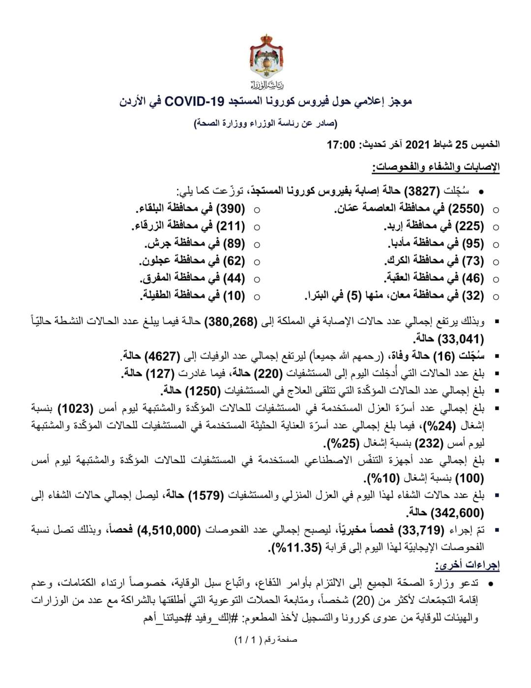 (2550) في محافظة العاصمة عمّان.(390) في محافظة البلقاء.(225) في محافظة إربد.(211) في محافظة الزرقاء.(95) في محافظة مأدبا.(89) في محافظة جرش.(73) في محافظة الكرك.(62) في محافظة عجلون.(46) في محافظة العقبة.(44) في محافظة المفرق.(32) في محافظة معان، منها (5) في البترا.(10) في محافظة الطفيلة.وبذلك يرتفع إجمالي عدد حالات الإصابة في المملكة إلى (380,268) حالة فيما يبلغ عدد الحالات النشطة حاليّاً (33,041) حالة.سُجّلت (16) حالة وفاة، (رحمهم الله جميعاً) ليرتفع إجمالي عدد الوفيات إلى (4627) حالة.بلغ عدد الحالات التي أُدخِلت اليوم إلى المستشفيات (220) حالة، فيما غادرت (127) حالة.بلغ إجمالي عدد الحالات المؤكّدة التي تتلقى العلاج في المستشفيات (1250) حالة.بلغ إجمالي عدد أسرّة العزل المستخدمة في المستشفيات للحالات المؤكّدة والمشتبهة ليوم أمس (1023) بنسبة إشغال (24%)، فيما بلغ إجمالي عدد أسرّة العناية الحثيثة المستخدمة في المستشفيات للحالات المؤكّدة والمشتبهة ليوم أمس (232) بنسبة إشغال (25%).بلغ إجمالي عدد أجهزة التنفّس الاصطناعي المستخدمة في المستشفيات للحالات المؤكّدة والمشتبهة ليوم أمس (100) بنسبة إشغال (10%).بلغ عدد حالات الشفاء لهذا اليوم في العزل المنزلي والمستشفيات (1579) حالة، ليصل إجمالي حالات الشفاء إلى (342,600) حالة.تمّ إجراء (33,719) فحصاً مخبريّاً، ليصبح إجمالي عدد الفحوصات (4,510,000) فحصاً، وبذلك تصل نسبة الفحوصات الإيجابيّة لهذا اليوم إلى قرابة (11.35%).