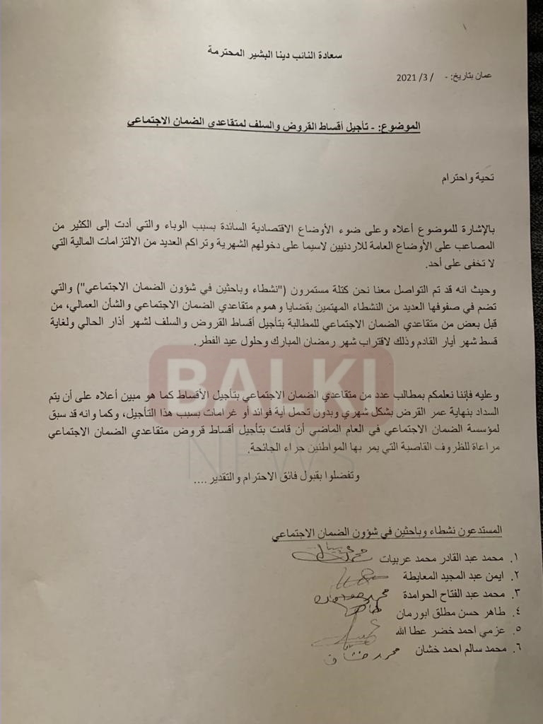 تبنت النائب المحامية دينا البشير مذكرة نيابية وقع عليها عدد من النواب تطالب رئيس الحكومة بتأجيل تسديد اقساط القروض والسلف القائمة على متقاعدي الضمان الاجتماعي لمدة ثلاثة شهور ( اذار ونيسان وايار) نظرا للظروف الاقتصادية الصعبة التي تمر بها البلاد بسبب جائحة كورونا اضافة الى اقتراب موعد شهر رمضان المبارك وعيد الفطر السعيد .