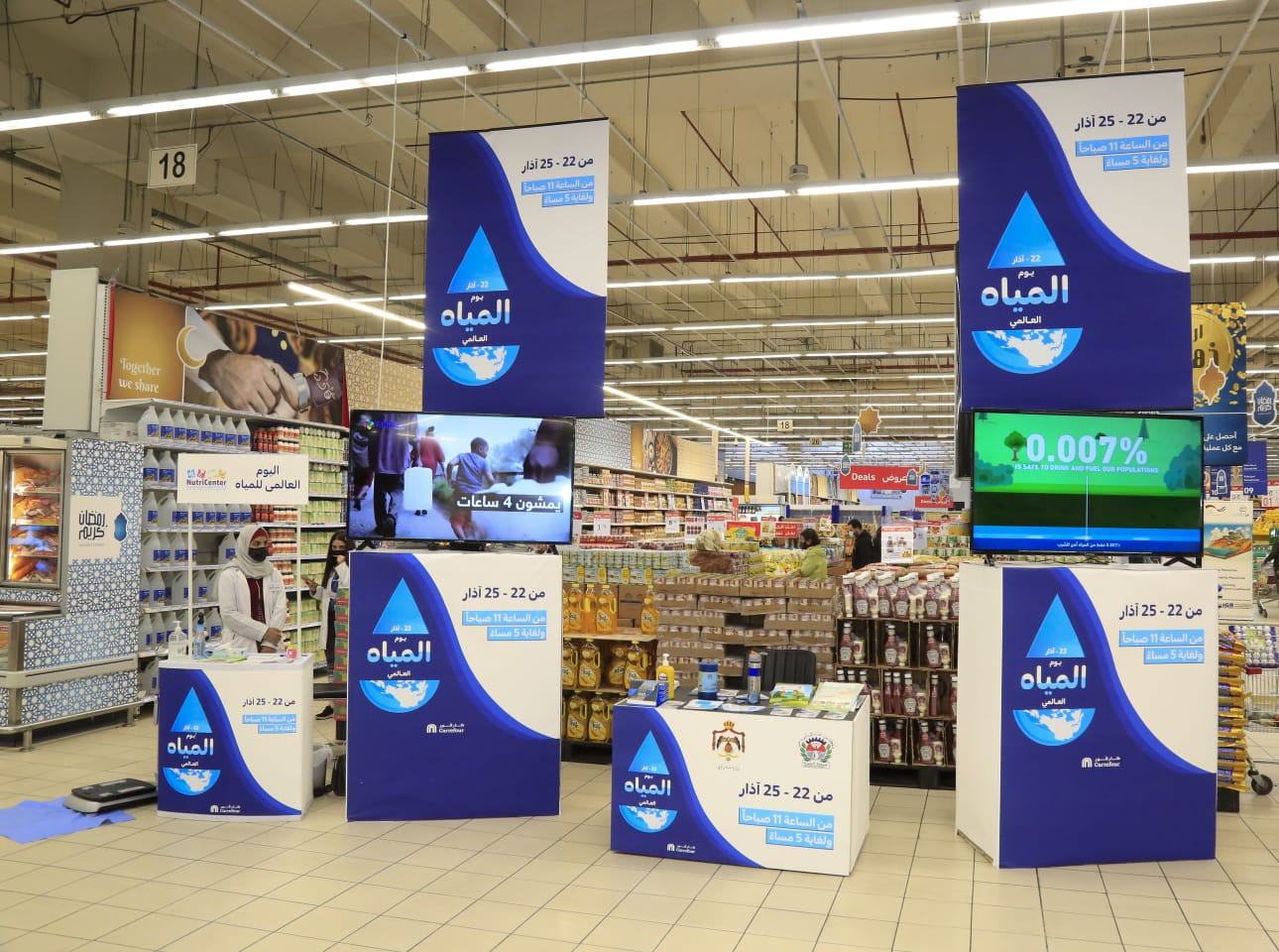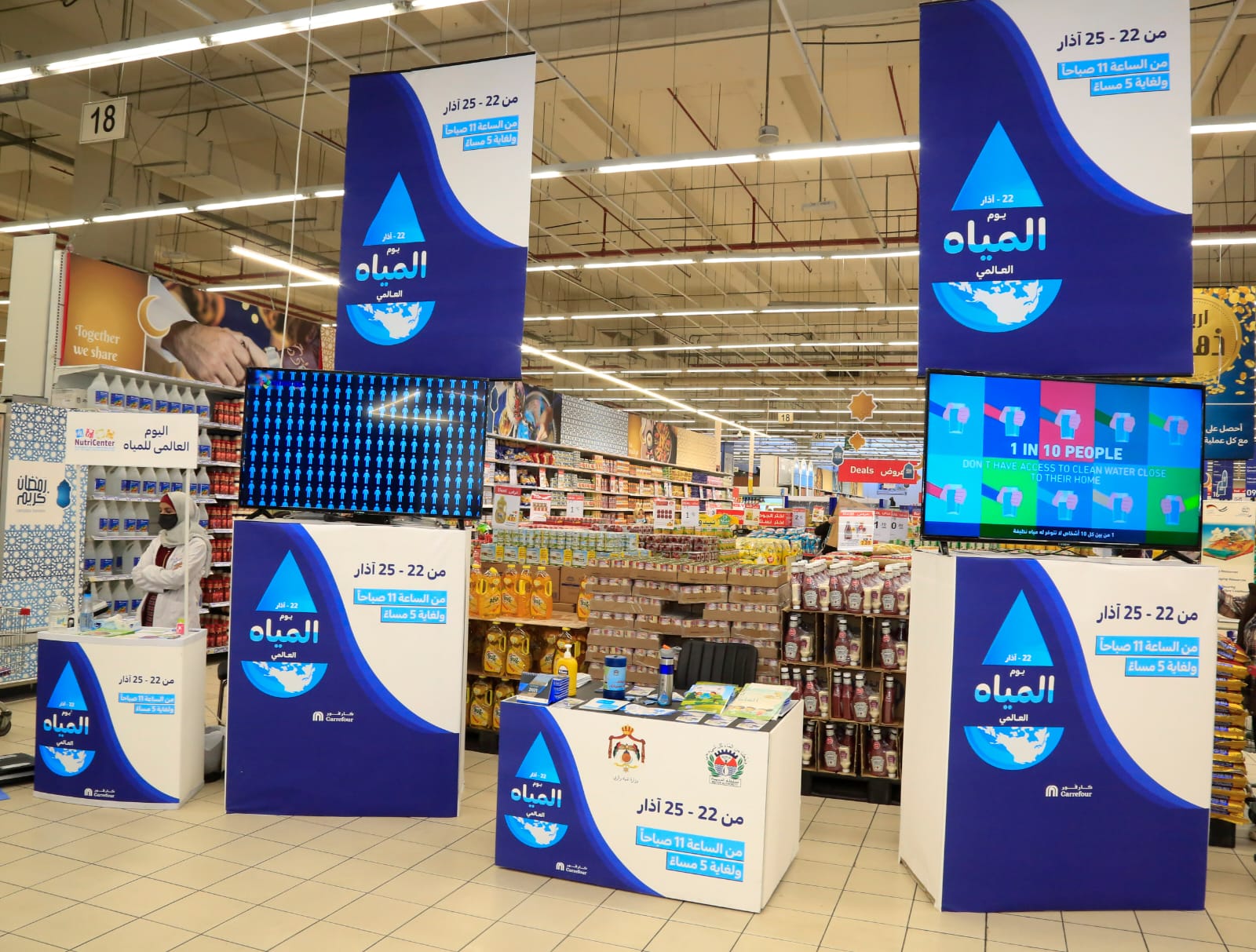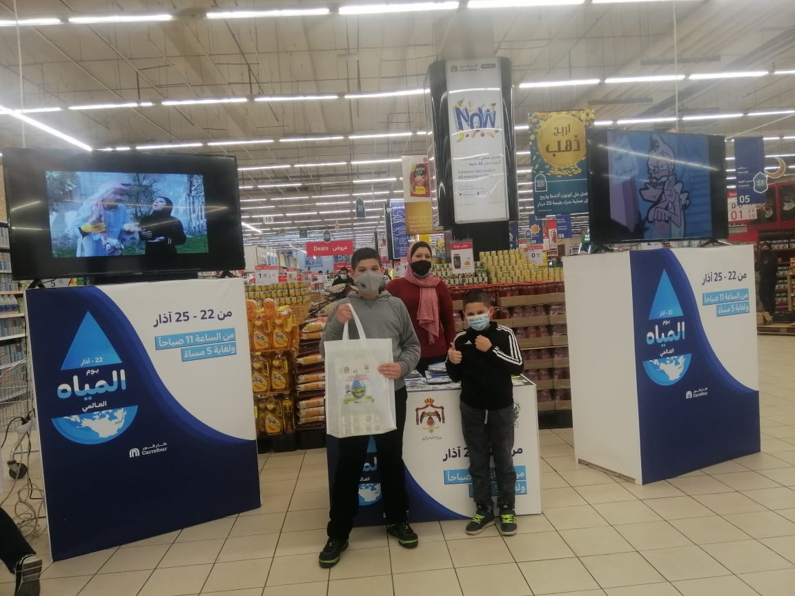 الأردن- عمّان 24 آذار 2021: ضمن مشاركة الأردن العالم الاحتفال بيوم المياه العربي والعالمي تحت شعار ( تثمين المياه)، والذي يصادف يوم 22 آذار من كل عام/ أقامت وزارة المياه والري / إدارة شؤون الإعلام والإتصال/ مديرية التوعية المائية معرضاً للصور والمجسمات التي تجسد موضوع الاحتفال العالمي بالمياه والقيمة الثمينة لهذه السلعة التي لاتقدر بثمن وذلك بالتعاون مع كارفور، التي تملكها وتديرها شركة "ماجد الفطيم" في الأردن.