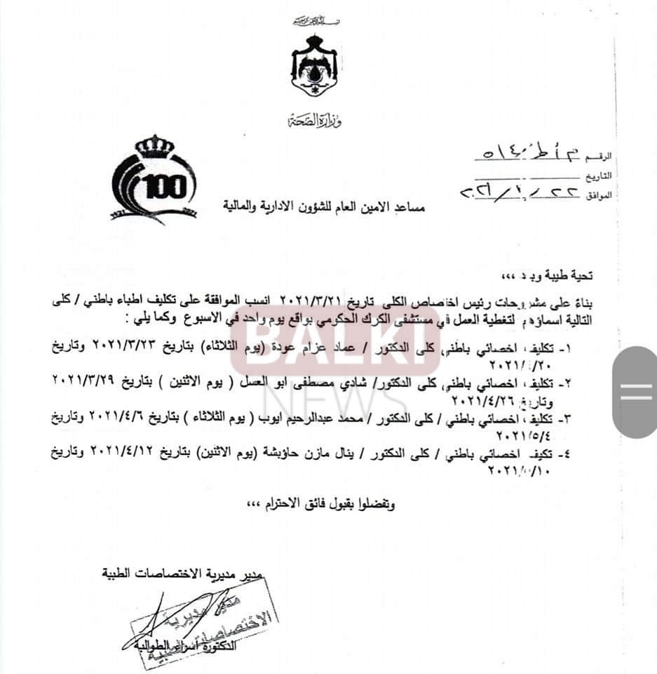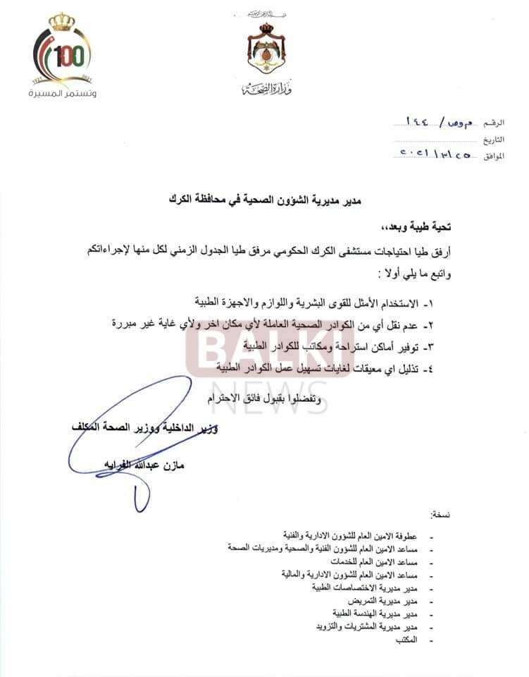 اوعز وزير الصحة المكلف مازن الفراية بتلبية إحتياجات مستشفى الكرك الحكومي من عدد من التخصصات الطبية .