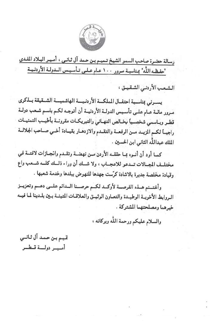 وعبر الشيخ آل ثاني في بيان صحفي نشره الديوان الأميري في الدوحة الثلاثاء، على موقعه الالكتروني، بمناسبة مرور 100 عام على تأسيس الدولة الأردنية، عن تهانيه وتبريكاته، متمنيا للشعب الاردني الرفعة والتقدم والازدهار بقيادة صاحب الجلالة الملك عبد الله الثاني.