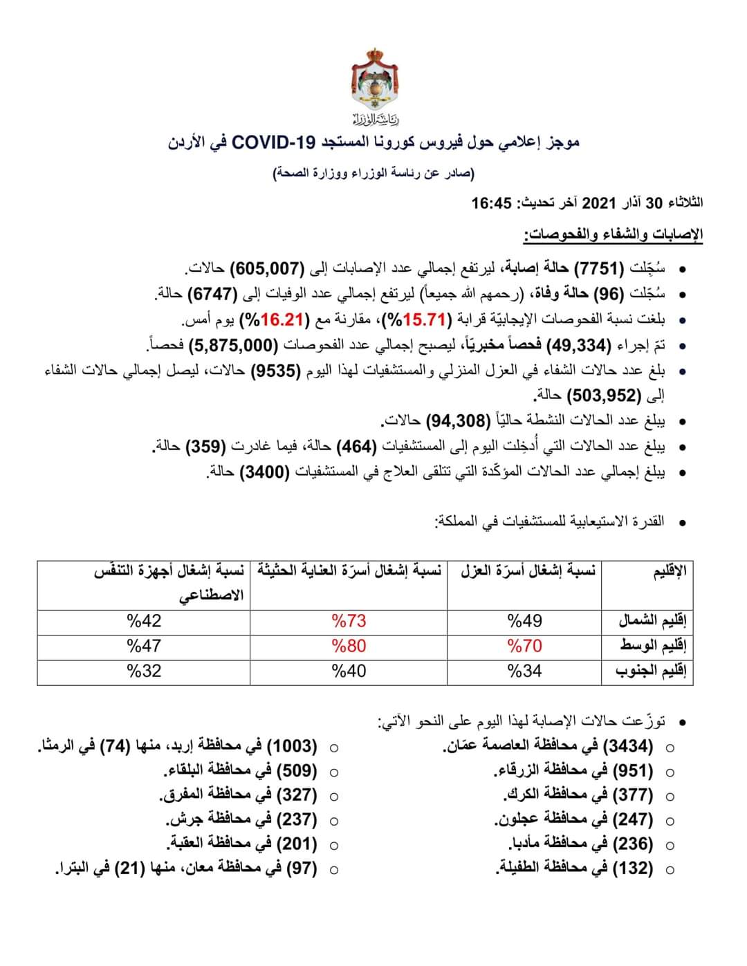 سجل في المملكة اليوم 96حالة وفاة و 7751 إصابة بفيروس كورونا