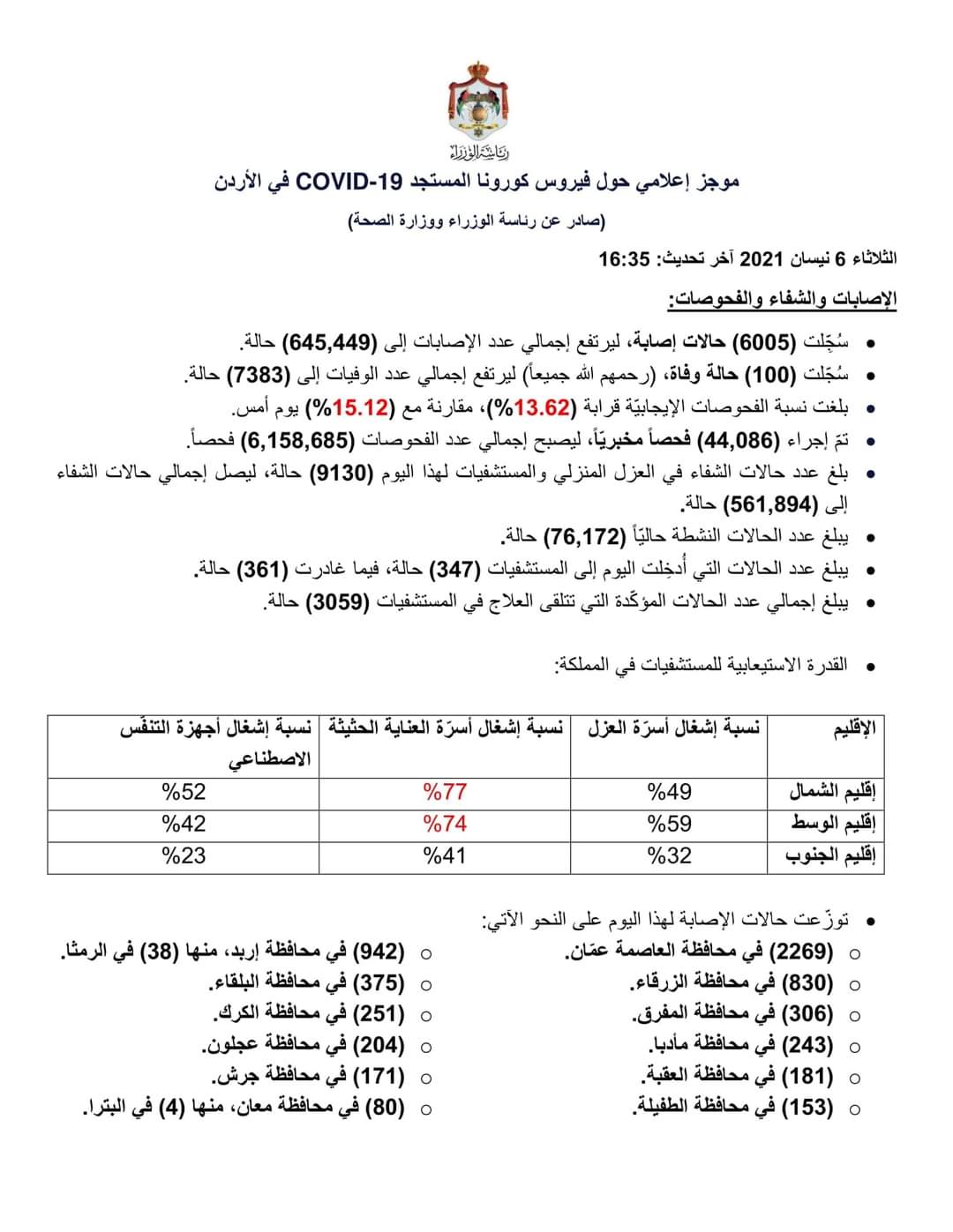 سجل في المملكة اليوم 100 حالة وفاة و 6005 إصابة بفيروس كورونا