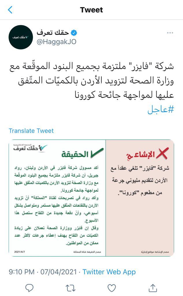 وأكد مسوؤل شركة فايزر في الأردن ولبنان، رواد جبريل، الأربعاء، أن شركة فايزر ملتزمة بجميع البنود الموقعة مع وزارة الصحة لتزويد الأردن بالكميات المتفق عليها لمواجهة جائحة كورونا.