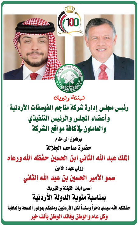 الفوسفات الأردنية تهنئ بمئوية الدولة