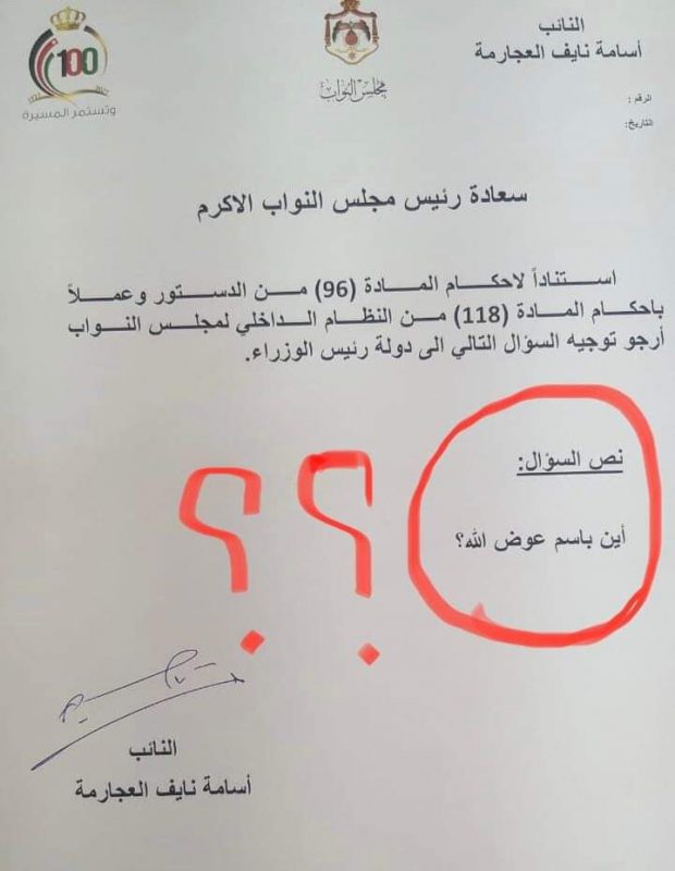 وجه النائب اسامة العجارمة سؤالا نيابيا للحكومة يطلب فيها معرفة مكان تواجد الوزير الاسبق باسم عوض الله بعد اعلان قرار توقيفه قبل ايام على ذمة قضية “الفتنة”.