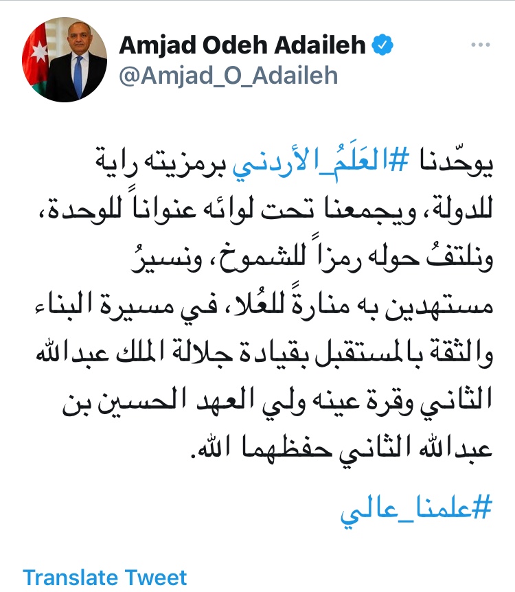 غرد السفير الأردني في القاهرة ومندوب الاردن الدائم بجامعة الدول العربية امجد العضايلة ، على حسابه الشخصي في موقع "تويتر"، بمناسبة اليوم الوطني للعلم بِمَا يلي :