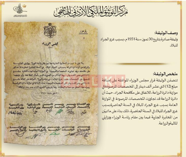 تظهر وثائق و محفوظات مركز التوثيق الملكي الهاشمي أن أسراب الجراد قد تتابعت على غزو البلاد سنوات عديدة منذ نشأة الإمارة، غير أن الجهود الرسمية والشعبية كانت تنجح في كل مرة بمكافحته و القضاء عليه .