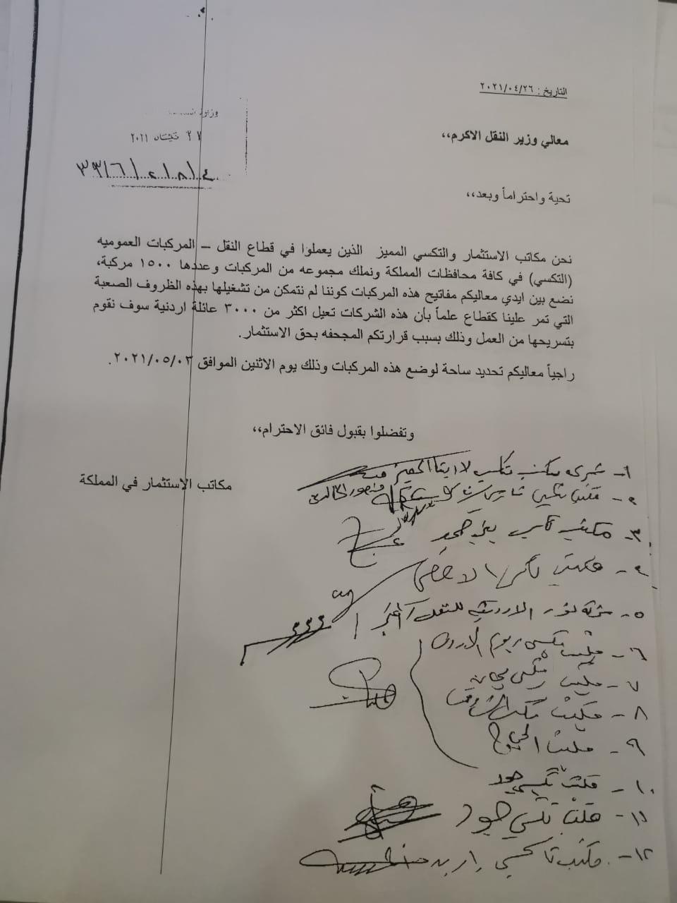وجه أصحاب مكاتب الاستثمار والتكسي المميز الذين يعملون في قطاع النقل - المركبات العمومية (التكسي) في كافة محافظات المملكة بكتاب لوزير النقل طالبوا فيه الوزير باعادة تشغيل مركباتهم البالغ عددها 1500 مركبة والتي تعيل اكثر من 3000 عائلة أردنية وسيتم تسريحها من العمل بسبب القرارات التي وصفوها بالمجحفة بحق الاستثمار.