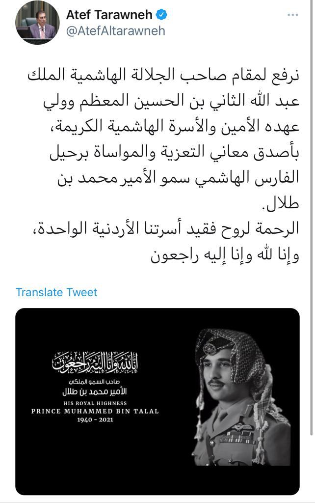 رئيس مجلس النواب السابق المهندس "عاطف الطراونة" ينعى سمو الأمير محمد بن طلال