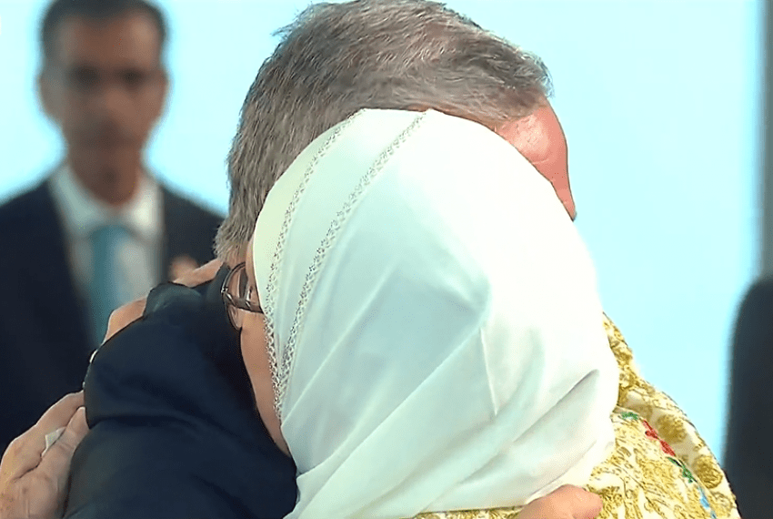 وعانق جلالة الملك السيدة الهام عبدالباقي جمو خلال تسلمها الوسام عن والدها عبدالباقي جمو الشخصية السياسية والدينية والذي شغل مناصب عدة في الدولة.