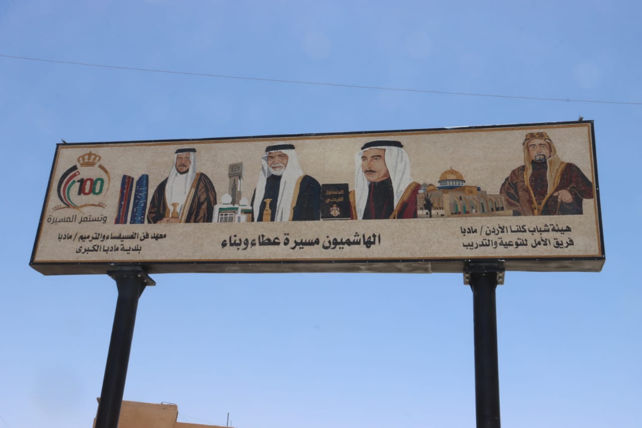 وتحدث منسق هيئة شباب كلنا الأردن في مادبا الدكتور حسن الشوابكة عن تجسيد اللوحة لمسيرة القادة الهاشميين وسردها قصة إنجاز مئة عام من العطاء، وتسليطها الضوء على محطات بارزة في رعاية المقدسات والوصاية الهاشمية، التي قدم الملك المؤسس عبدالله الأول ابن الحسين روحه في سبيلها، وكذلك محطات في تطور الدولة الأردنية ومؤسساتها على أكثر من صعيد، مروراً بإنجازات ملوك بني هاشم، ووصولاً إلى عهد الملك المعزز عبدالله الثاني حفظه الله.