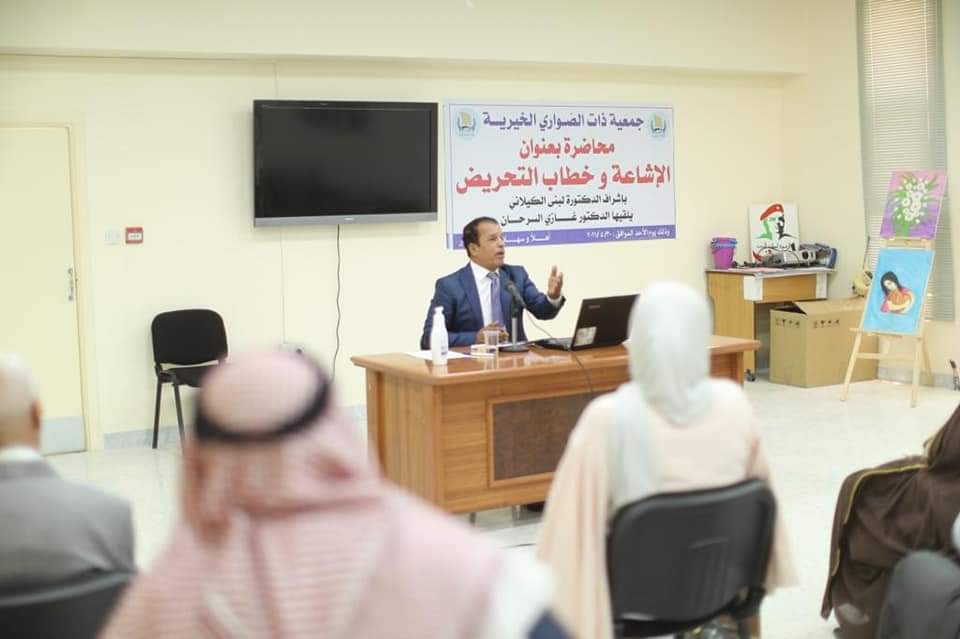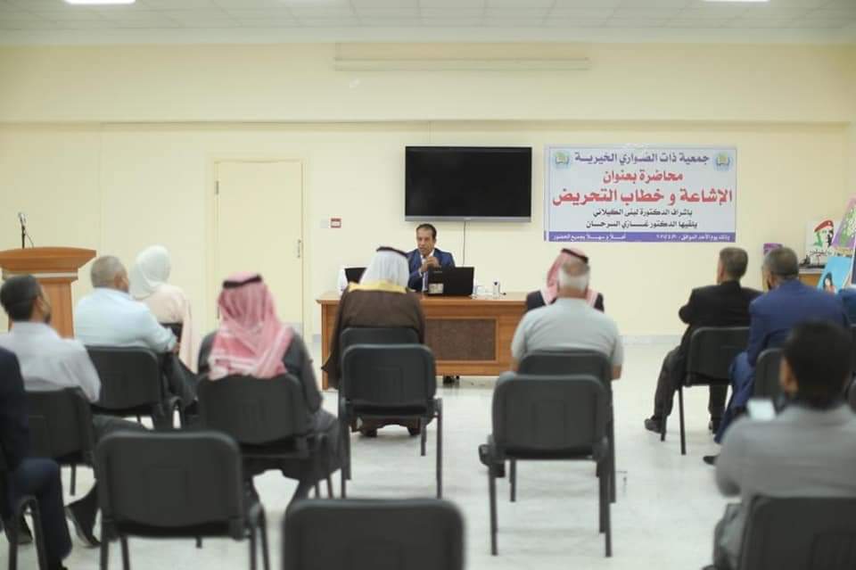 ألقى الزميل الدكتور الصحفي غازي القظام السرحان محاضره في محافظه الكرك حضرها جمع غفير من أبناء عشيره الطراونه يمثلون اطيافا عشائريه وتربويه ونسائيه ونقابيه وشعبيه في بلده ';الحسينيه" بلواء المزار الشمالي وسط مدينه الكرك بدعوه من جمعيه ذات الصواري حول خطاب" الكراهيه والإشاعه". وبدء الاحتفال بالسلام الملكي وايات من الذكر الحكيم. وأكد الزميل السرحان في محاضرته على ضروره ايلاء مكافحه خطاب التحريض والكراهيه والإشاعه اهميه كبرى وتبيان مخاطرها على الوطن والمواطن لما لها من آثار سلبيه في زعزعه قيم التعاضد والتسامح والتراحم والتماسك والسلم المجتمعي، واضاف السرحان ان خطاب الكراهيه وخطاب التحريض وجهان لعمله واحده ويقودان للفتنه والشكوك وانعدام الطمأنينة والثقه تجاه الآخر وهذا ما يجب علينا جميعا في هذا الوطن أن نتنبه له وأن نفوت الفرصه على كل من يحاول أن يمس وحدتنا الوطنيه او أن يشكك في سلامه المسيره الأردنيه المظفره بقياده جلاله الملك عبد الله الثاني بن الحسين،واوضح الدكتور السرحان أن خطاب الكراهيه يمثل الخطاب العدائي تجاه الآخر وهو مجموعه من العبارات التي تؤيد التحريض على الضرر والتمييز والعدوانيه والعنف وان من أسباب انتشار خطاب الكراهيه غياب منظومه القيم وضعف رقابه الأسره والخطاب الديني المتطرف وتأثير وسائل الإعلام ووسائل التواصل الإجتماعي على الاتجاهات الفكريه لدى الناس وغياب القوانين الرادعه ، واشار الزميل الدكتور السرحان إلى الكيفيه التي تمكن الدوله والمواطنين من التصدي لخطاب الكراهيه بصوره المختلفه بما لا يقوض حريه التعبير. وبين السرحان ان مفهوم التحريض يقوم على دعوه الجمهور بشكل مباشر او غير مباشر للقيام بفعل او أفعال ضد أفراد أو مجموعات باستخدام طرق علانيه او مخفيه مؤكدا ان مفهوم التحريض بتعريف التشريع الاردني أنه جريمه تقوم على زرع فكره الجريمه وتهيأه ظروفها ودفع شخص آخر لارتكابها وأوقع المشرع الأردني العقوبه على التحريض بالأشغال الشاقه من ١٥-٢٠سنه.