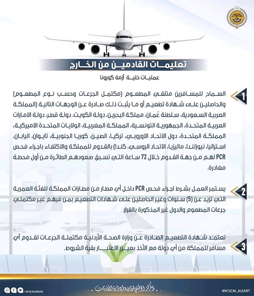 أصدر المركز الوطني للأمن وإدارة الأزمات، عمليات خلية الازمة، التعليمات المحدثة للمسافرين القادمين والمغادرين للمملكة الأردنية الهاشمية.