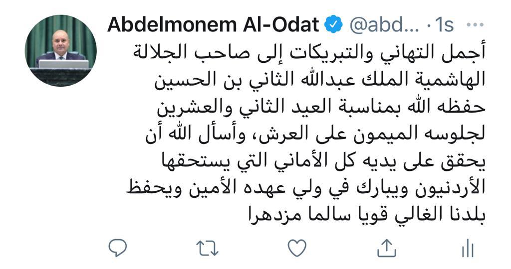 رفع رئيس مجلس النواب المحامي عبد المنعم العودات التهاني والتبريكات لمقام صاحب الجلالة الهاشمية الملك عبدالله الثاني بن الحسين المعظم بمناسبة العيد الثاني والعشرين للجلوس الملكي.