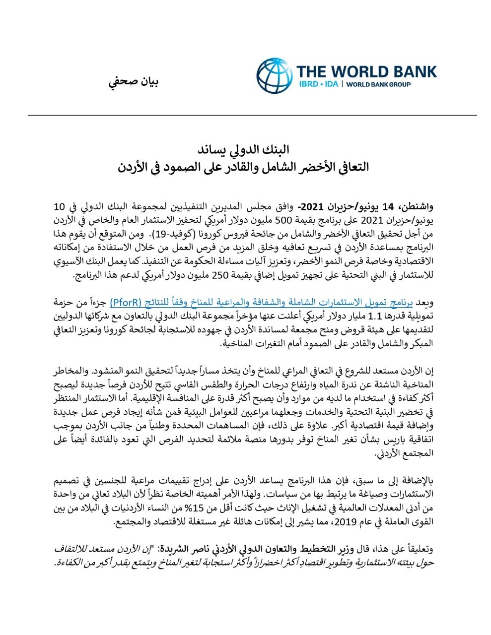 وافق مجلس المديرين التنفيذيين لمجموعة البنك الدولي، على برنامج بقيمة 500 مليون دولار لتحفيز الاستثمار العام والخاص في الأردن من أجل تحقيق التعافي الأخضر والشامل من الجائحة.