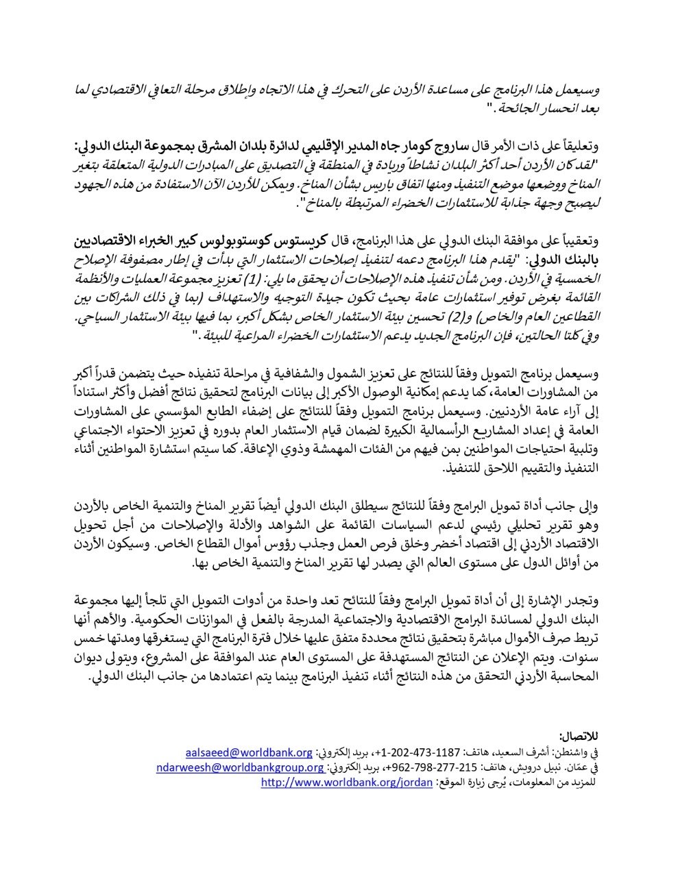 ومن المتوقع أن يقوم هذا البرنامج بمساعدة الأردن في تسريع تعافيه وخلق المزيد من فرص العمل من خلال الاستفادة من إمكاناته الاقتصادية وخاصة فرص النمو الأخضر، وتعزيز آليات مساءلة الحكومة عن التنفيذ.