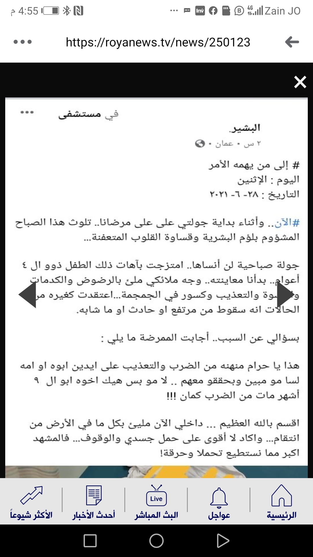 وبين المصدر ان طفلا يبلغ من العمر 9 اشهر وصل الى احد مستشفيات عمان بحالة وفاة ، فيما اسعف شقيقه البالغ من العمر 4 سنوات الى مستشفى حكومي ولديه إصابات خطيرة ابرزها كسر في الجمجمة.