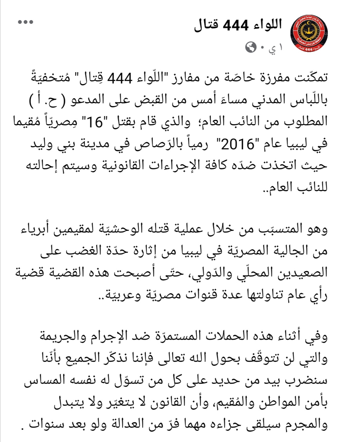 أعلن "اللواء 444 قتال" التابع لحكومة الوحدة الوطنية الليبية القبض على شخص تتهمه النيابة العامة بقتل 16 مواطنا مصريا في ليبيا عام 2016 رميا بالرصاص.