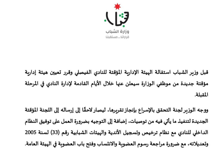 وزير الشباب يقبل استقالة الهيئة الإدارية للنادي الفيصلي ويعين هيئة إدارية مؤقتة جديدة من موظفي الوزارة