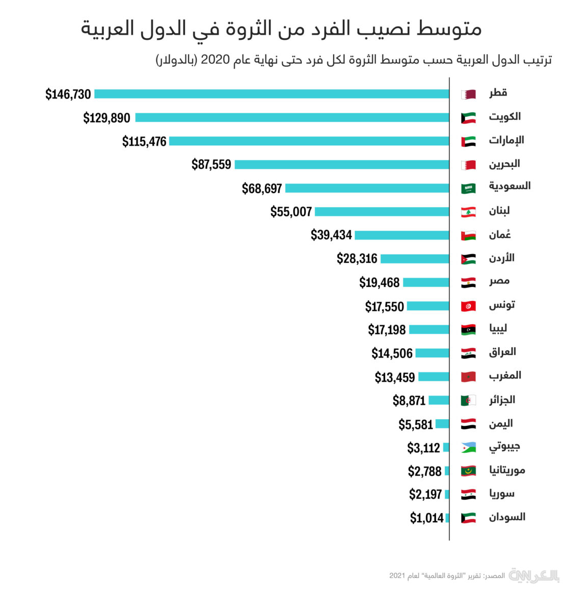 كشف تقرير الثروة العالمية لعام 2021، الصادر عن معهد الأبحاث التابع لبنك “كريدي سويس”، عن متوسط نصيب الفرد من ثروة الدول العربية.