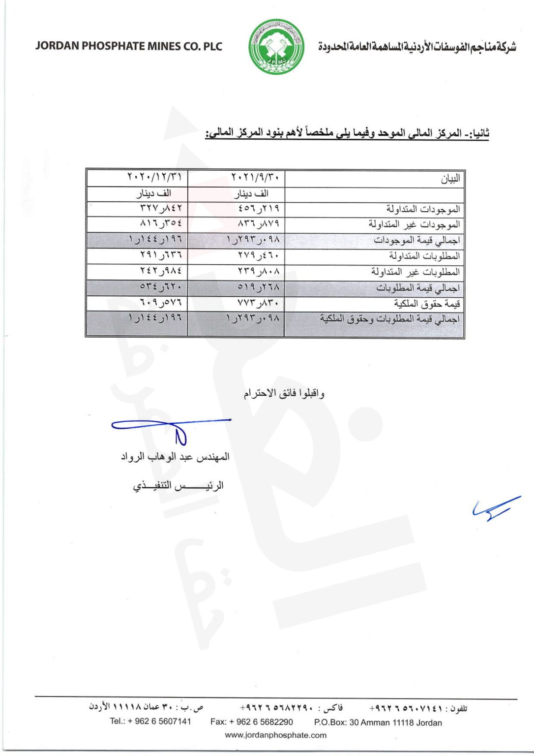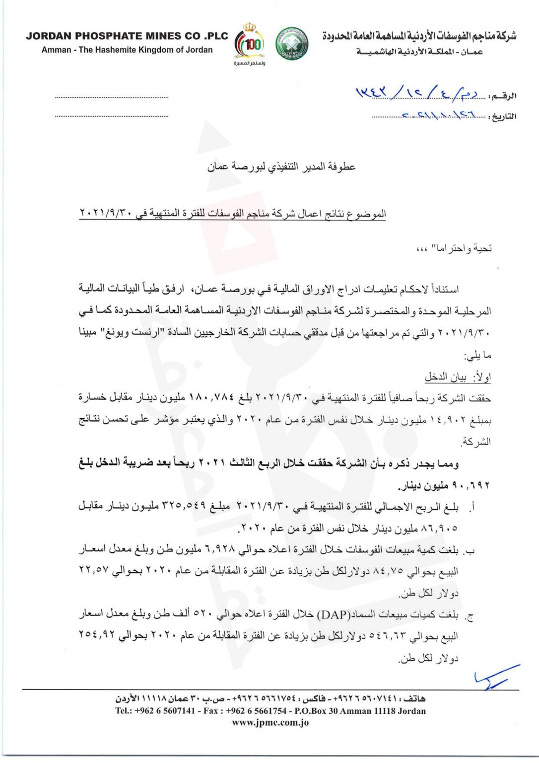 ووفق الإفصاح، أظهرت نتائج الدخل أن شركة الفوسفات حققت ربحا صافيا للفترة المنتهية 30 ايلول 2021 بمبلغ 180.784 مليون دينار مقابل خسارة بمبلغ 14.902 مليون دينار خلال نفس الفترة من عام 2020، ما يؤشر على تحسن نتائج الشركة.