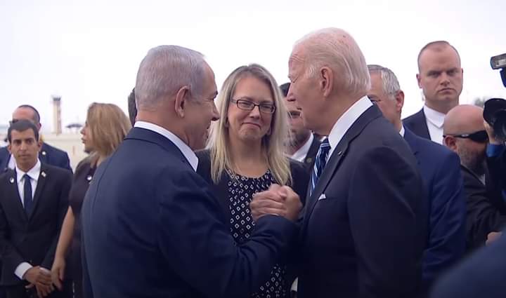 بايدن يصل تل ابيب بوجه عابس مرتديا بدلة سوداء وذلك ضمن مظاهر التضامن مع "اسرائيل "