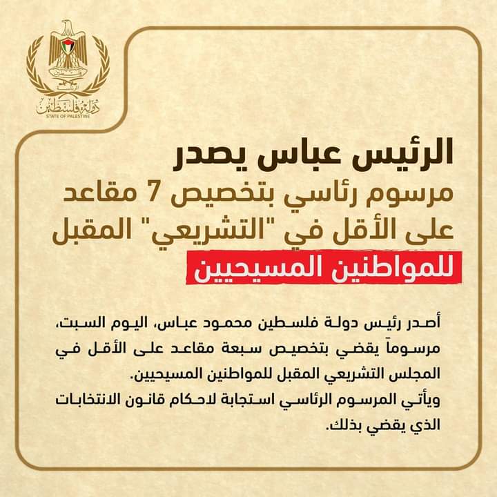 مرسوم رئاسي بتخصيص 7 مقاعد على الأقل في "التشريعي" المقبل للمواطنين المسيحيين