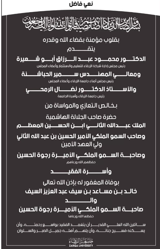 جامعة الزرقاء تنعى والد الأميرة رجوة الحسين