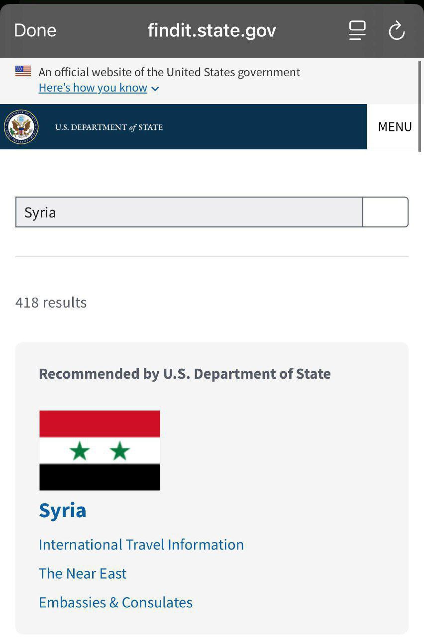 موقع الخارجية الأمريكية يعرض علم سوريا القديم في صفحة المعلومات الدولية