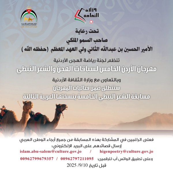 برعاية ولي العهد.. وزارة االثقافة تنظم مهرجان الأردن الخامس لسباقات الهجن والشعر النبطي.. وهذه شروط المشاركة