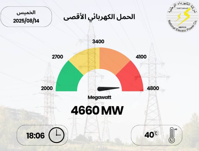 4660 ميجا واط الحمل الكهربائي الأقصى المسجل اليوم