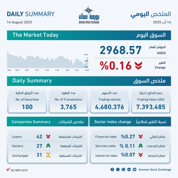 7.4 مليون دينار حجم التداول في بورصة عمان