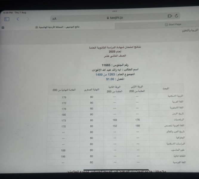ابنة الزميل رائد الأغوات تحقق نجاحًا باهرًا في التوجيهي